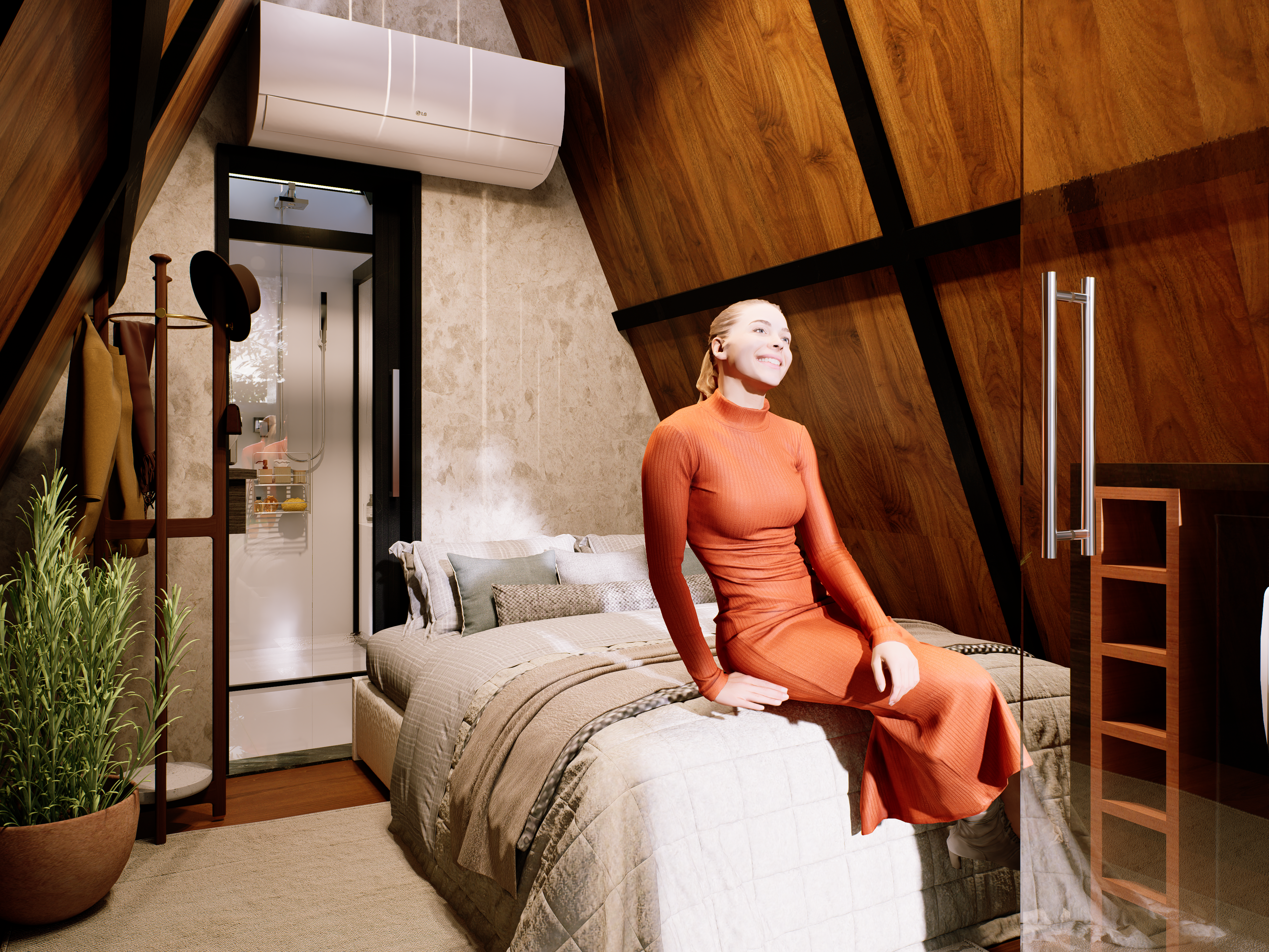 Chalé pode ser instalado em pequenos terrenos, ar-condicionado frio e quente, frigobar e banheiro completo.
